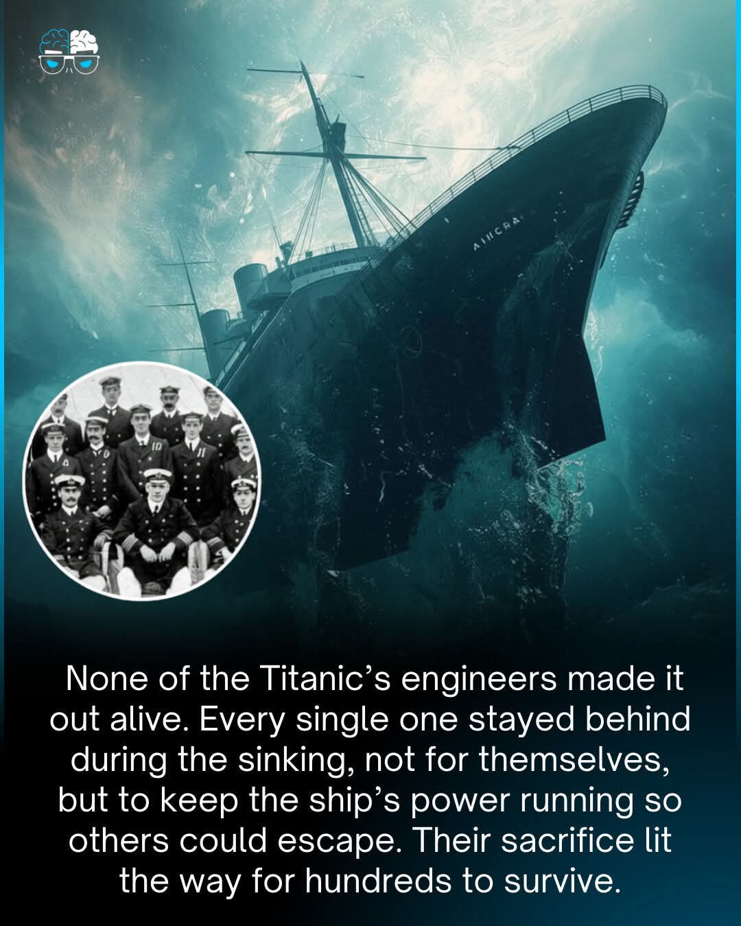 Not one engineer tried to flee. Not one reached for safety. They stayed below deck, every single one of them working desperately to keep the power running. They knew what it meant. No lights meant panic. No power meant no pumps, no messages, no way out for hundreds. So they held their ground, fighting against rising water and impossible odds… just so others could live. Because of them, people could see the corridors. Because of them, lifeboats were lowered. Because of them, Titanic’s final moments weren’t chaos, but lit with courage. They didn’t go down screaming. They went down saving.
