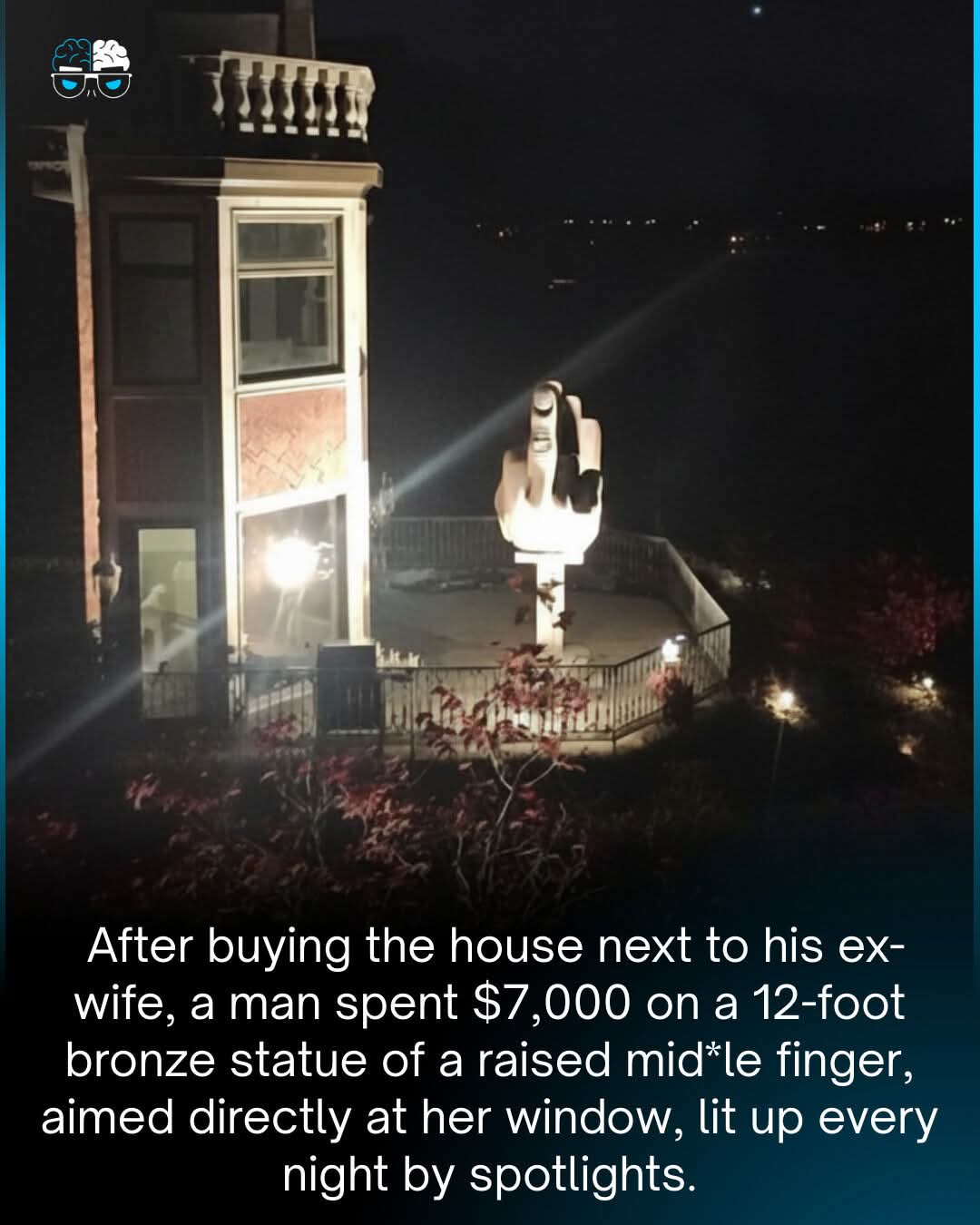 A man bought the house next to his ex-wife and then dropped $7,000 on a 12-foot-tall bronze middle finger statue. Not for art. Not for fun. But to face directly at her window, lit by glowing spotlights every night like a beacon of pettiness.