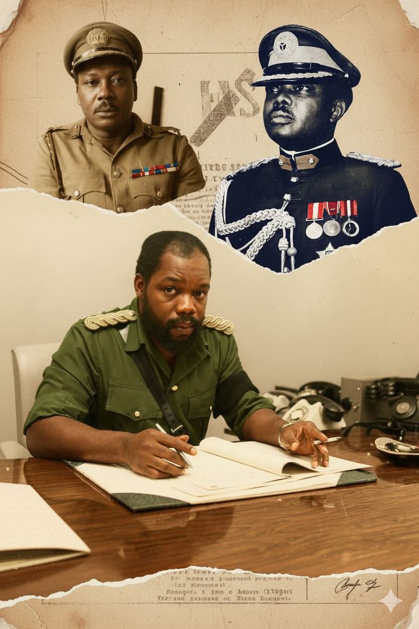 NB: Colourised photo collage of Johnson Aguiyi-Ironsi on the left, Murtala Muhammed on the right and Chukwuemeka Ojukwu below.