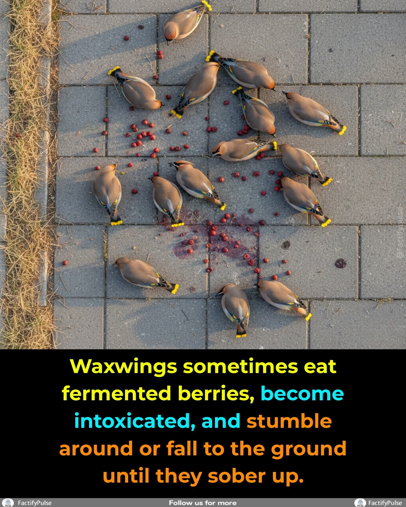 Waxwings sometimes gorge on fermented berries after freeze–thaw weather. The ethanol hits fast, and these speedy eaters can stumble, nap on the ground, or crash into windows until they sober up.