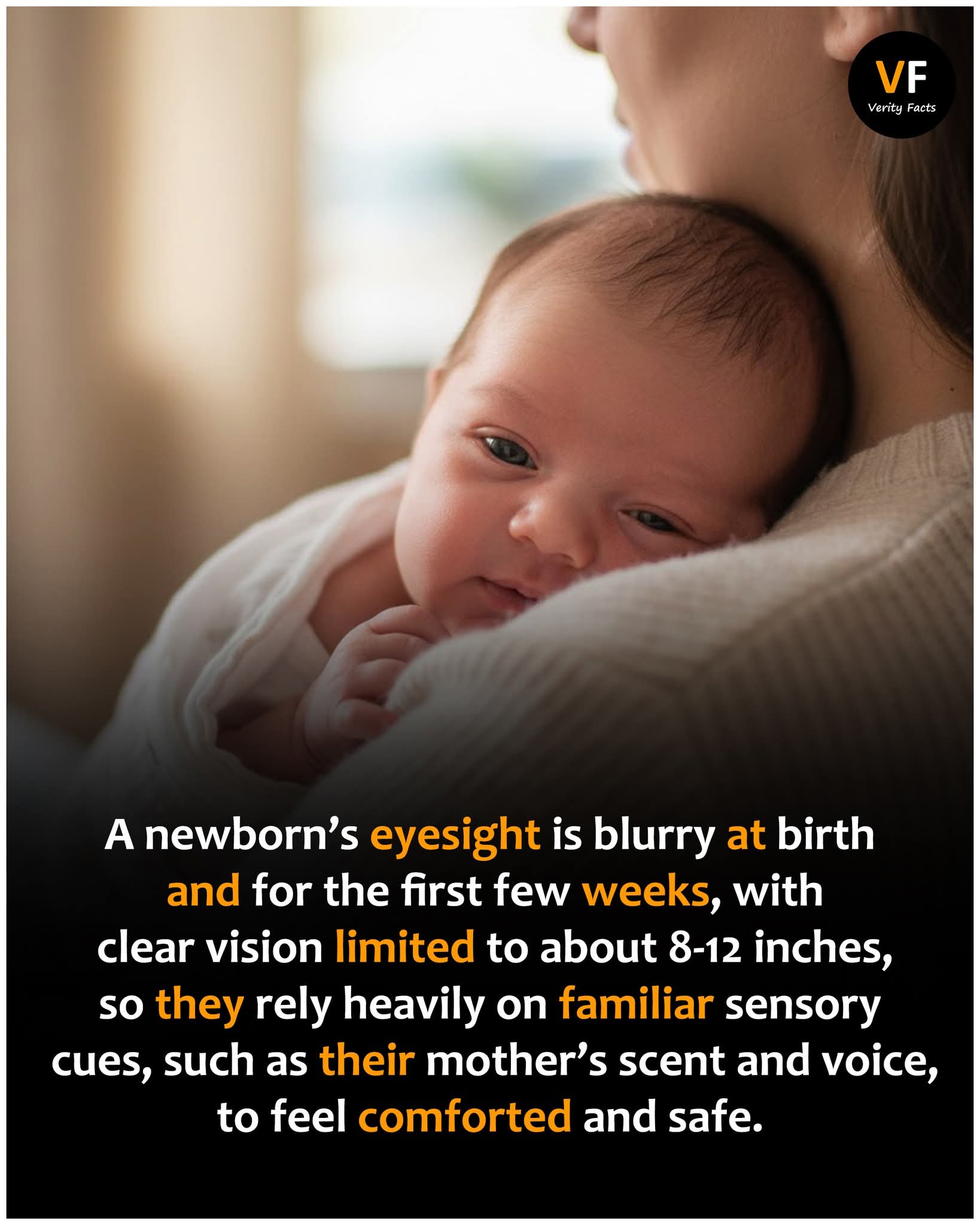 A newborn enters the world with blurry eyesight, able to see clearly only within 8–12 inches — just enough to recognize their mother’s face during feeding or cuddling. During these early weeks, babies rely more on their sense of smell and hearing than sight.