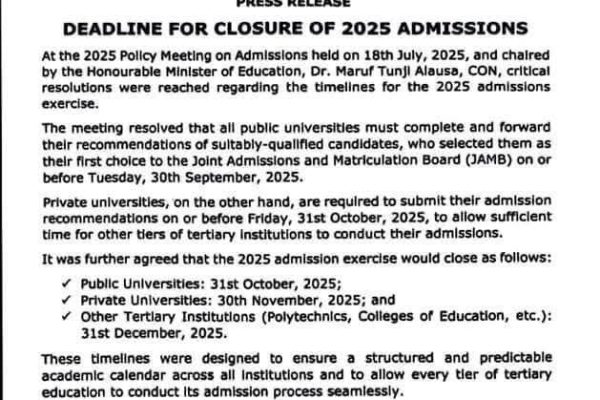 Education JAMB Announces Deadline for Closure of 2025 Admissions Samuel Adiodo3 months ago3 months ago01 mins Read More