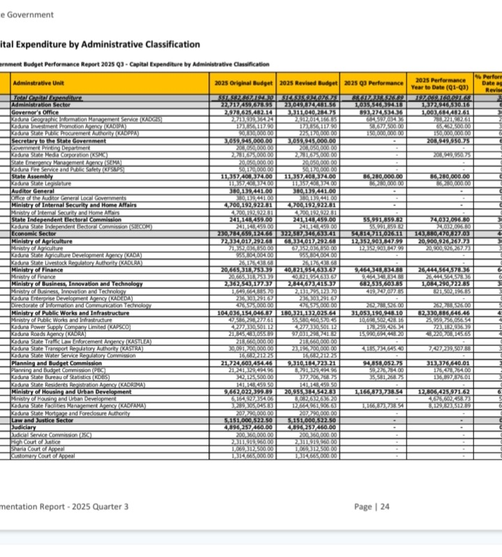 The document shows that N4.7 billion was budgeted by the Governor Uba Sani-led administration but as of the end of September, nothing had been spent on the capital needs of the Ministry of Internal Security and Home Affairs.
